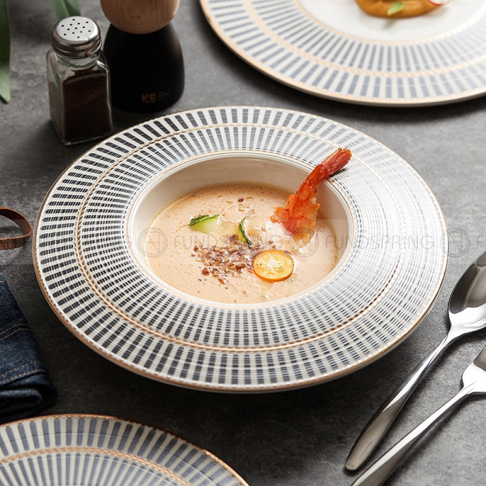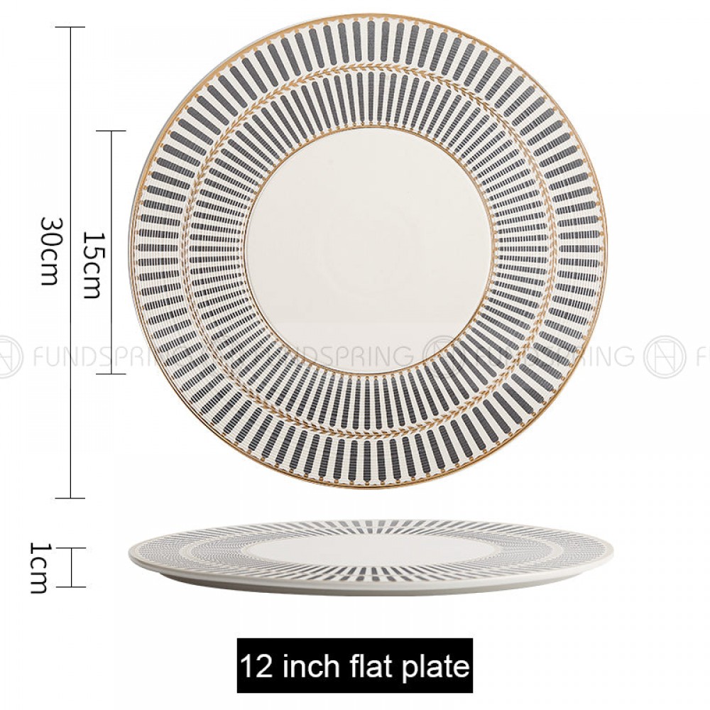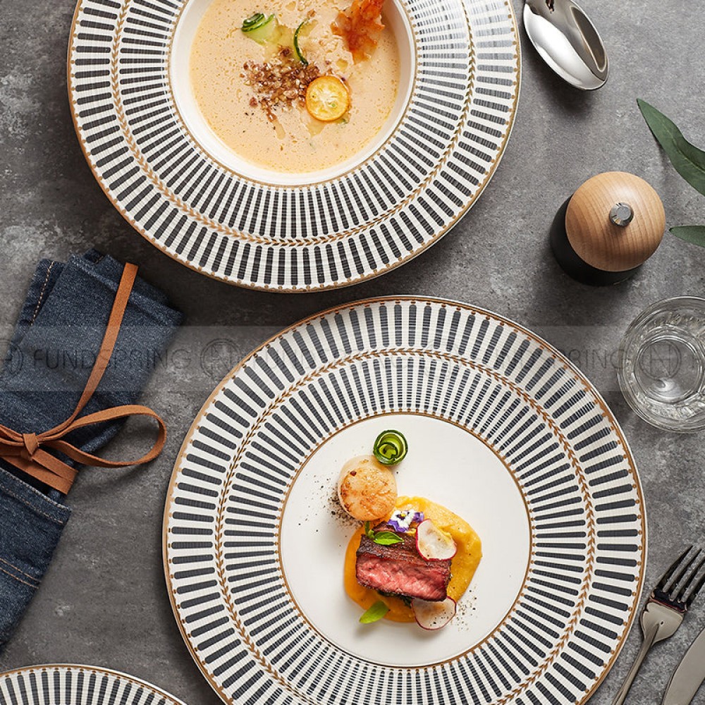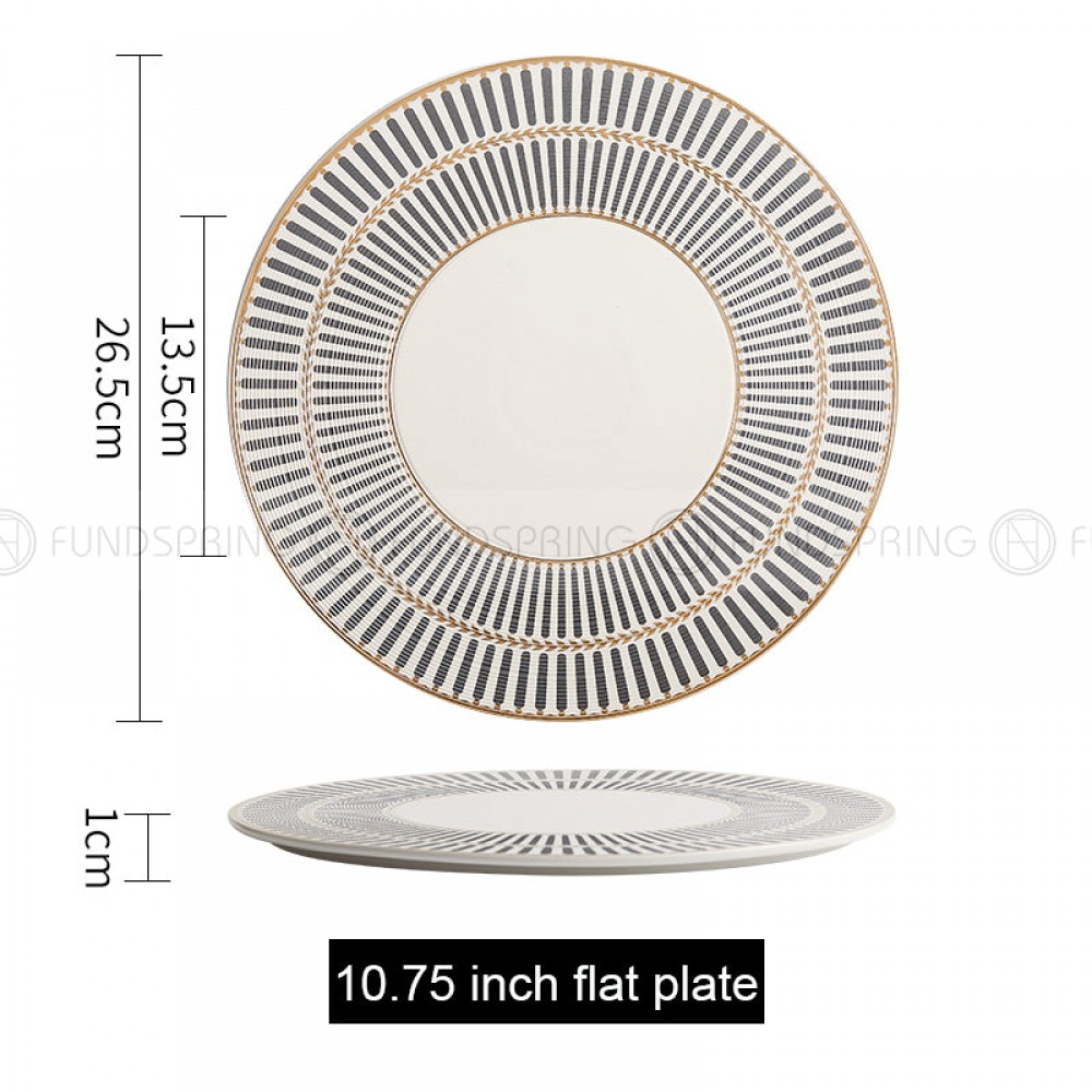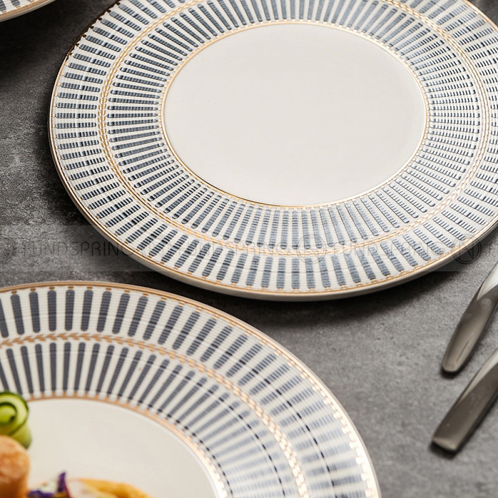 Designer Dinnerware Collection Weiss Series Grey/White with Gold Ring Ceramic Shallow Plate