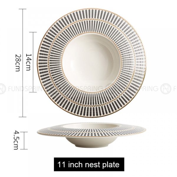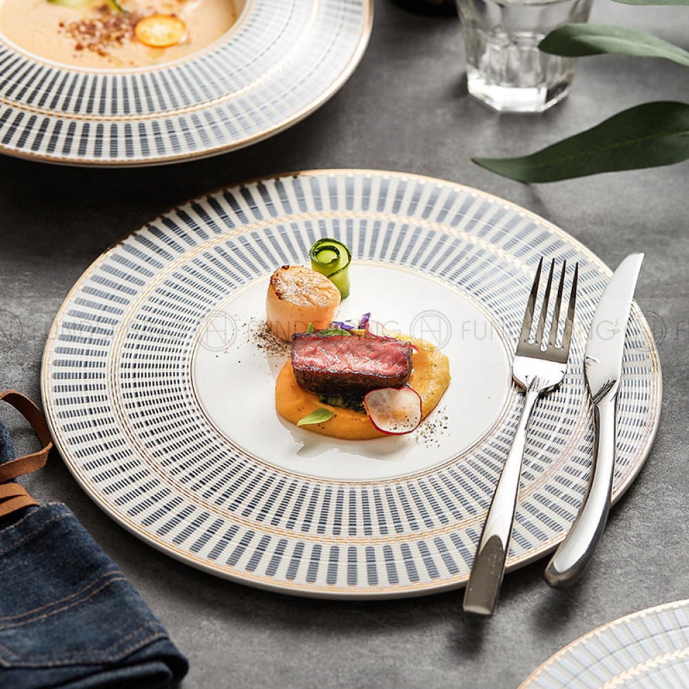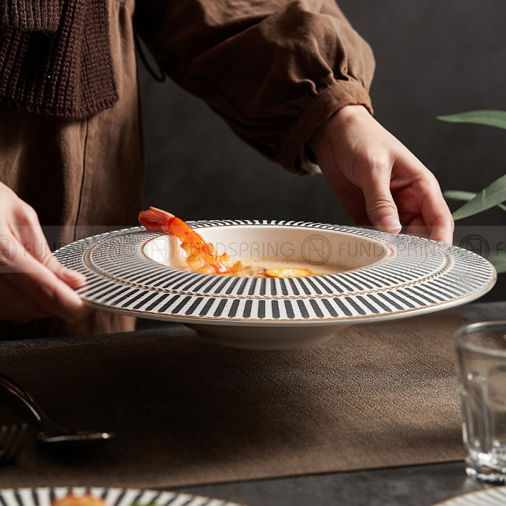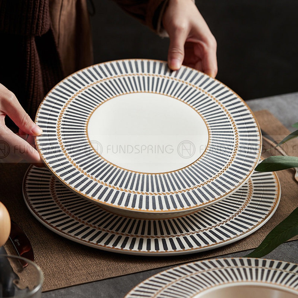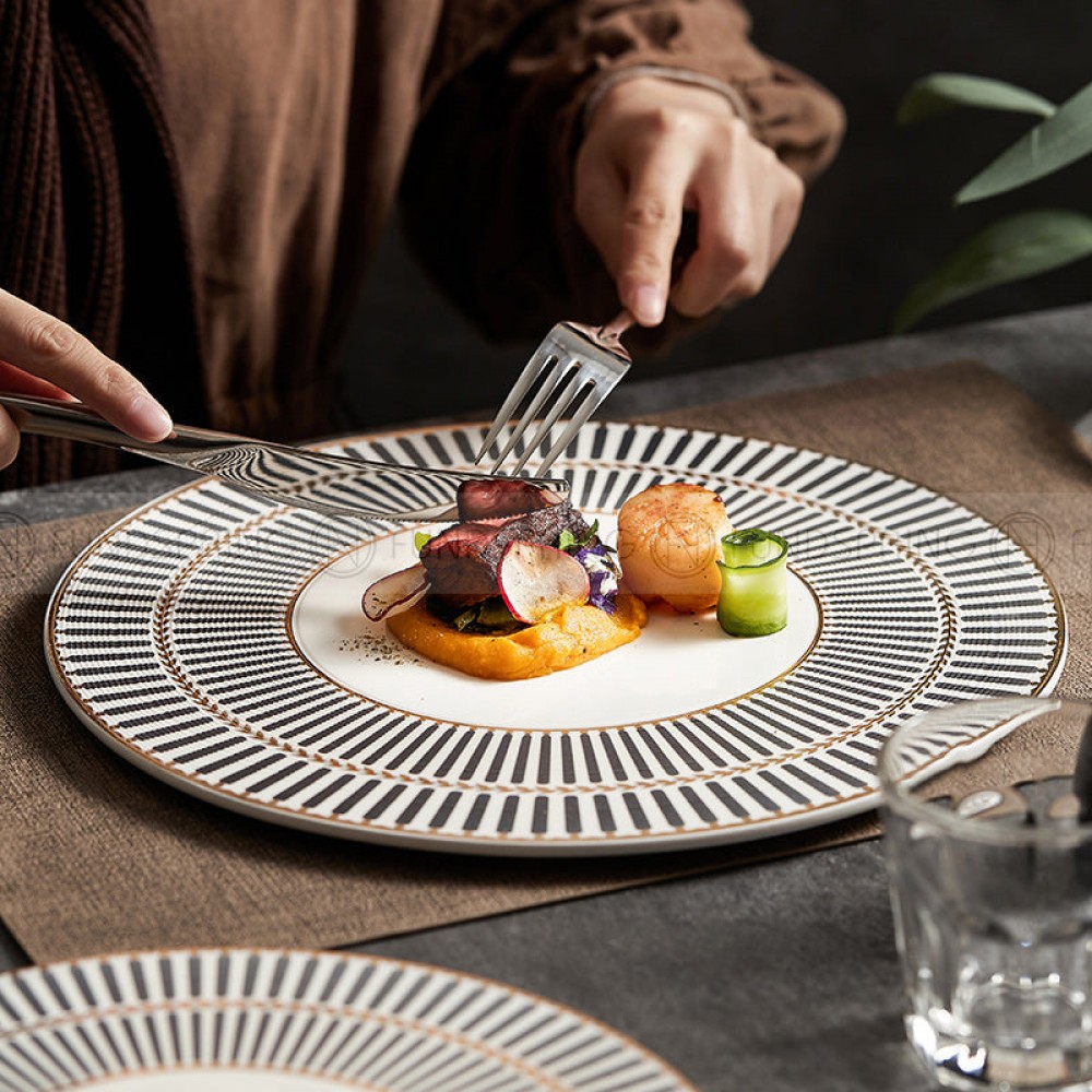 Designer Dinnerware Collection Weiss Series Grey/White with Gold Ring Ceramic Shallow Plate