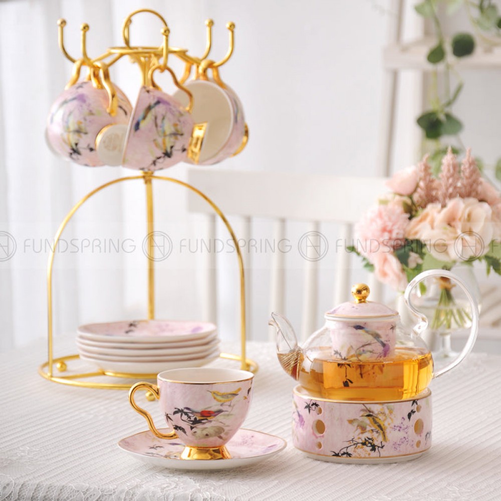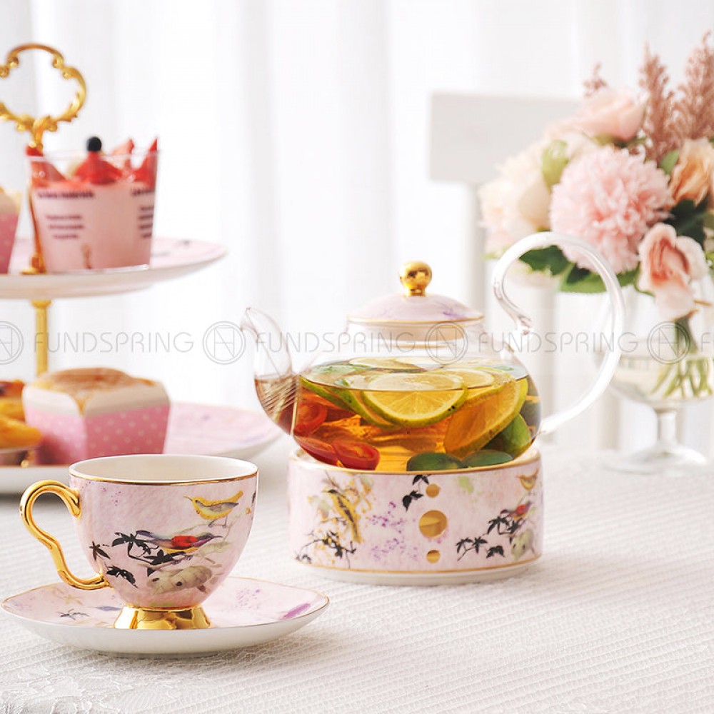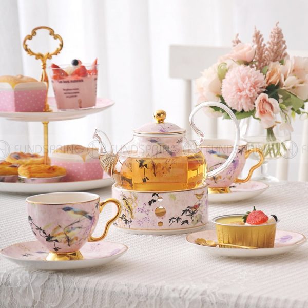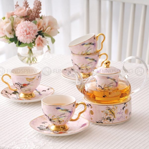 Elegant Bone China Tea Set with Glass Teapot and Ceramic Infuser, Candle Holder, Cups, and Saucers – 15 Pieces