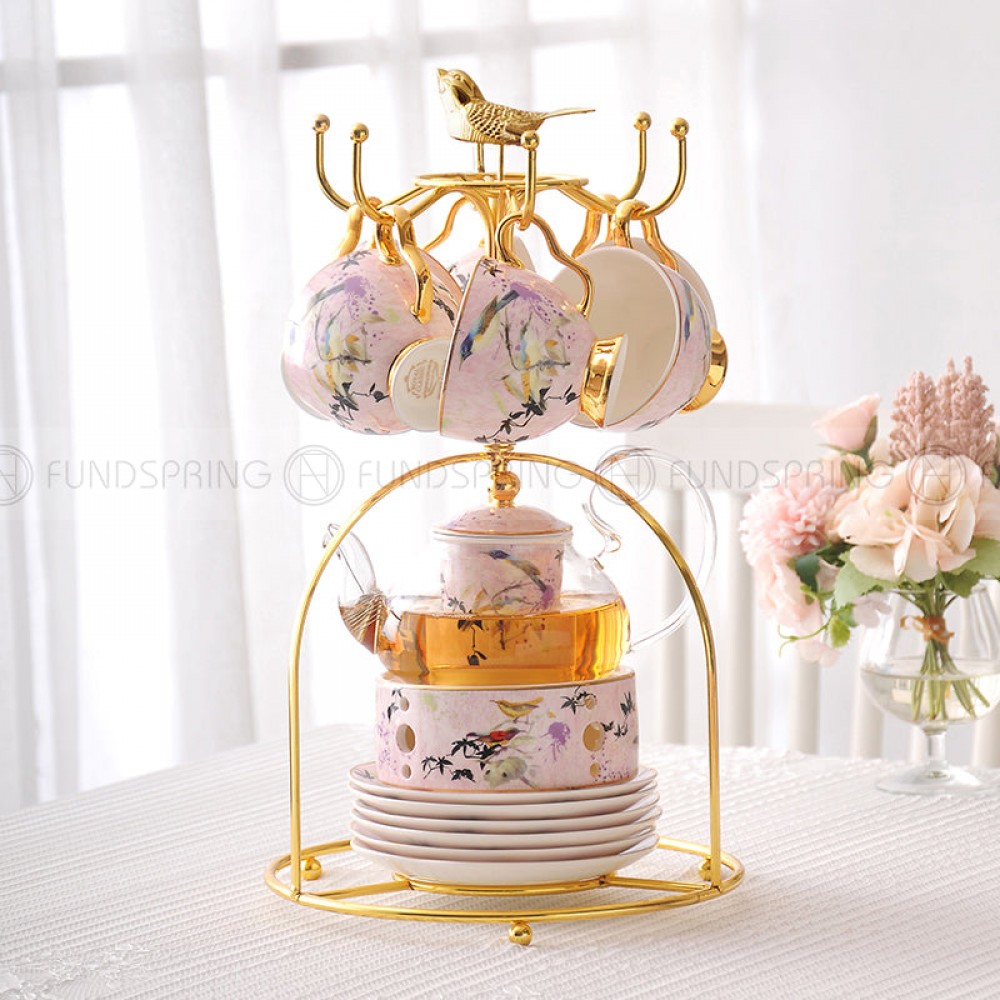 Pumpkin Teapot Set with Infuser and Warmer Ladies Pink Glass Bone China Tea Set – 10 Pcs