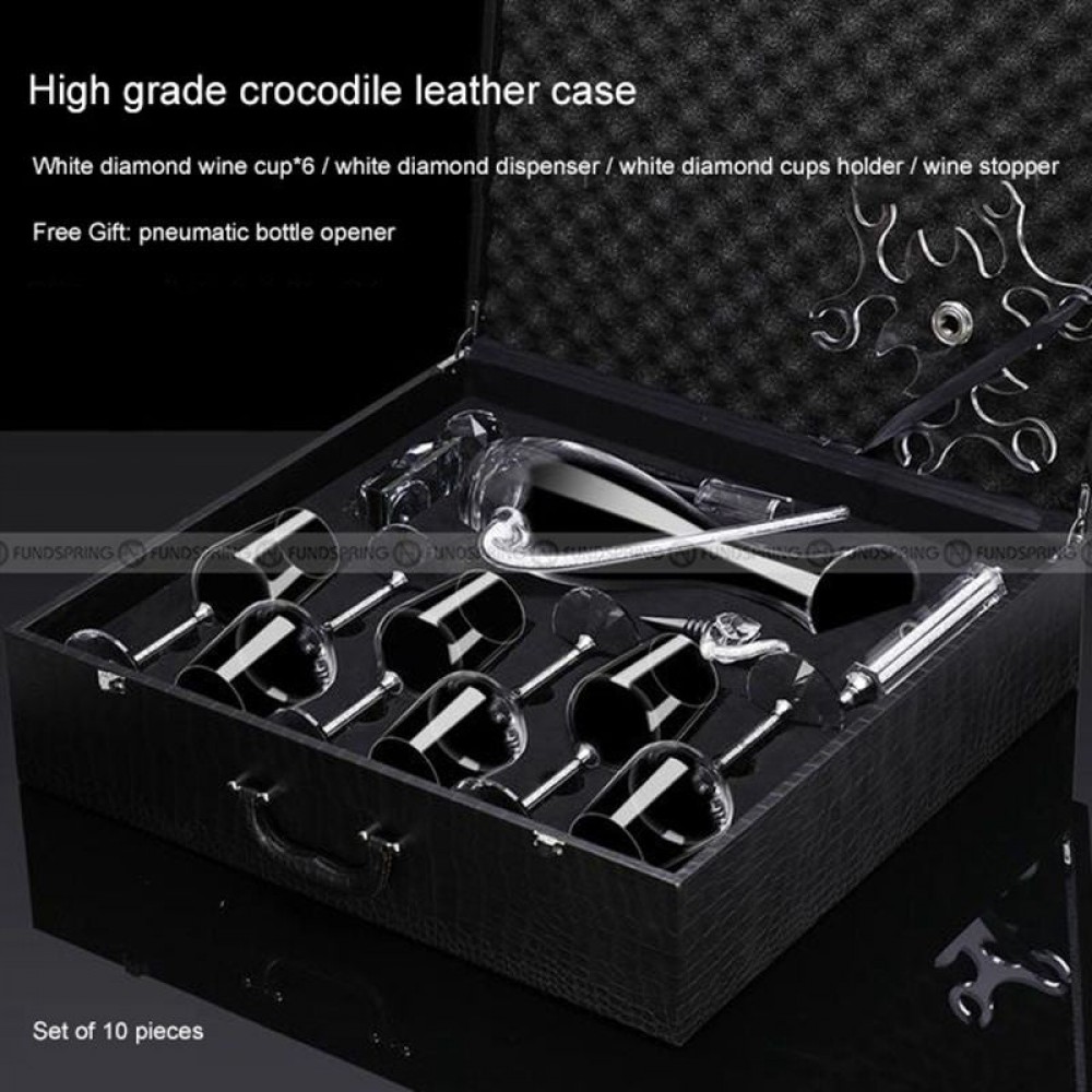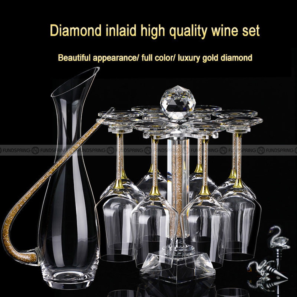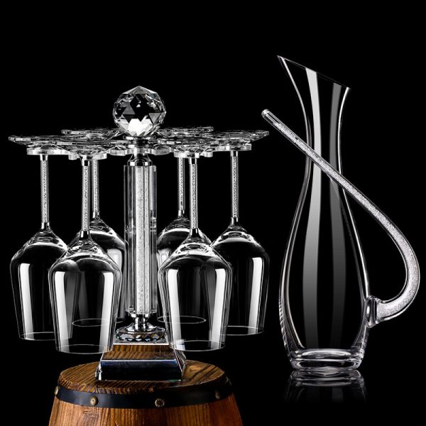 Introducing our exquisite Crystal Wine Glass Set, complete with a wine stopper, decanter, and goblets holder, making it the perfect gift set for birthdays, anniversaries, weddings, and any special occasion.Crafted from lead-free crystal glass, our red wine glasses offer unparalleled clarity, purity, and safety, enhancing your wine-drinking experience. The large bulb shape of the glasses ensures a natural and comfortable grip, while the moderate stem height and broad base provide excellent balance with every sip.This set includes a wine stopper, decanter, and holder, allowing you to customize your wine-drinking experience. Use the wine markers to add a personal touch, the decanter to enhance the flavor and aroma of your red wine, and the stopper to preserve your favorite wines for later enjoyment.For added convenience, our red wine glasses are dishwasher safe, although we recommend hand washing or using a cup brush to extend their lifespan. Please note that these glasses are not microwave-safe. Elevate your wine-drinking rituals with our exquisite Crystal Wine Glass Set, packaged in an elegant gift box for a truly memorable presentation.