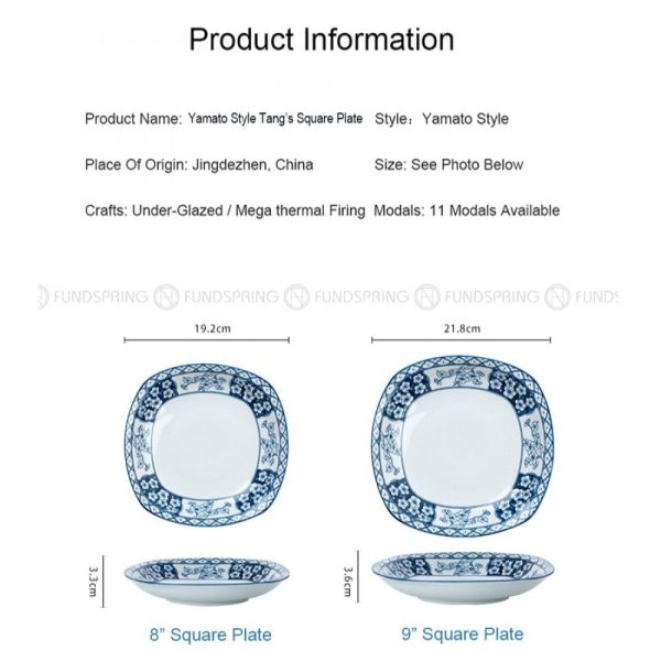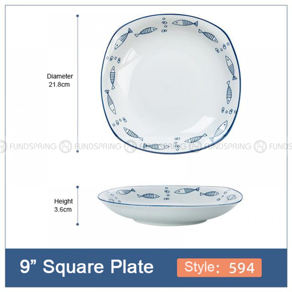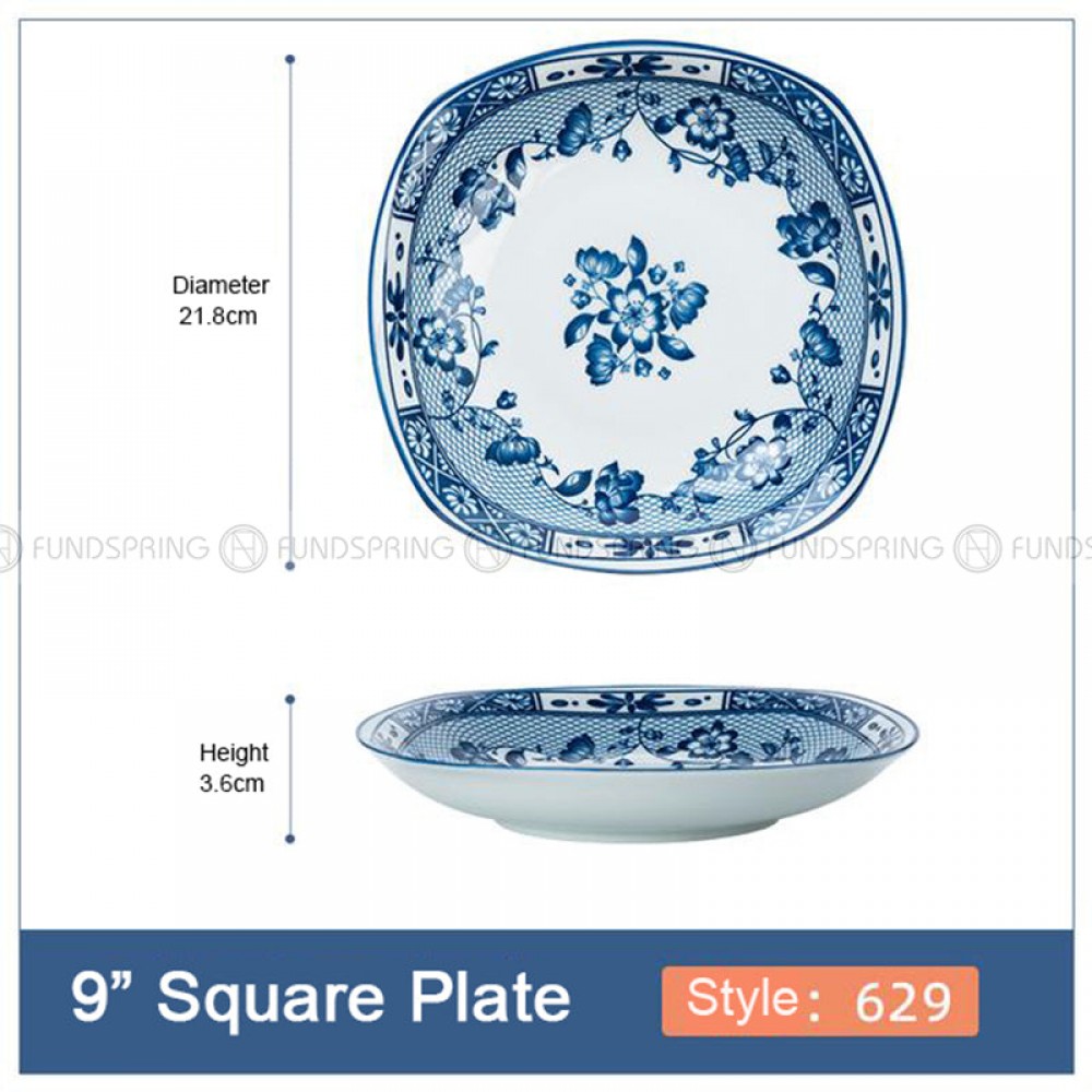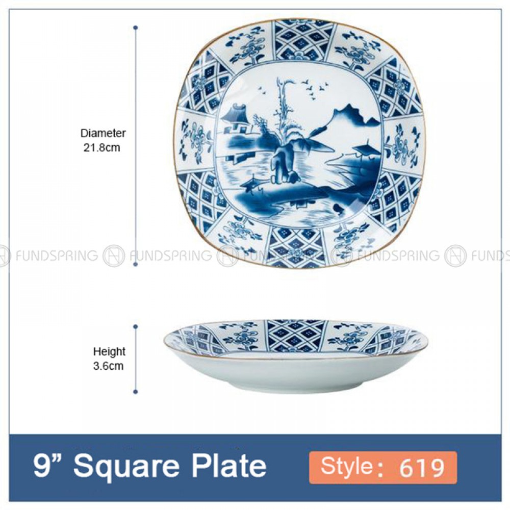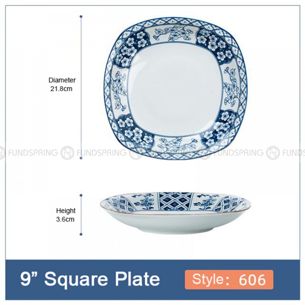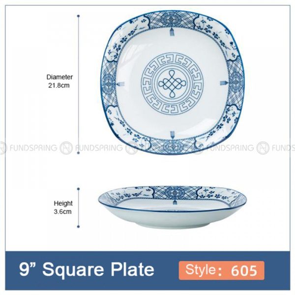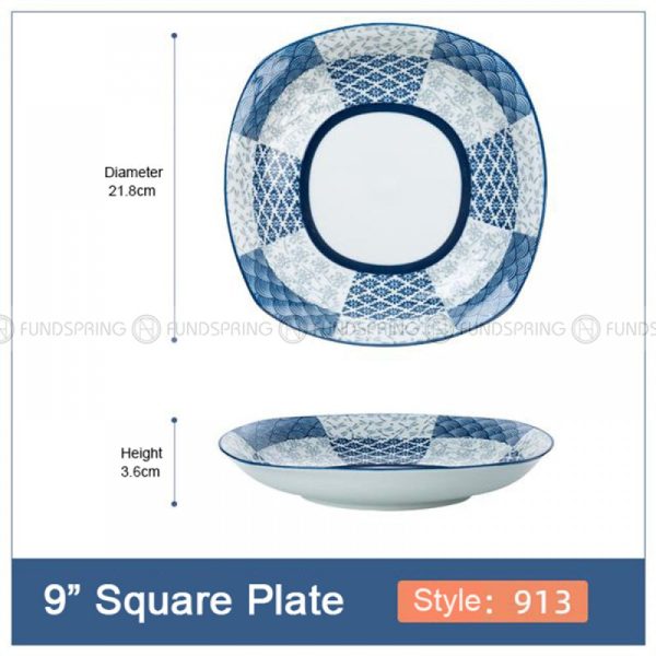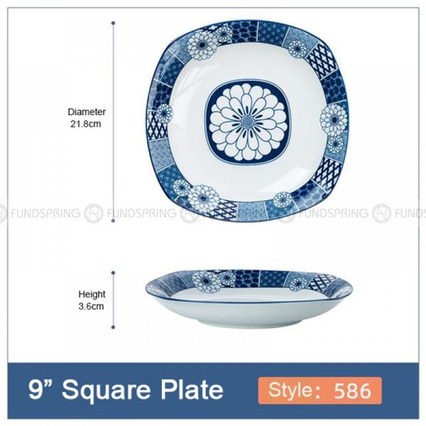 - A set of 4-pack 9-inch ceramic square plates with 7 different patterns, 21.8 cm diameter, and?3.6?cm height.