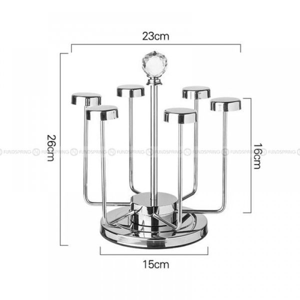 Material: 304 food grade stainless steel. Very durable, anti-rust and rotation design, can hold coffee or tea mugs bottles, and Glasses.Size: Base diameter: 5.9inch/ 15cm, overall height: 10.24inch/ 26cm, overall width: 9 inch/ 23cm, Suspension height 6.30″/ 16cm.Useage: It rotates smoothly without making any sound and also has a good grip on the table.?The stainless steel holder cup can be used as a drying rack for mugs cups bottles drinking glasses shot glasses and containers, meanwhile, the mug holder can also be used on your counter for display or on the table while eating and in your cabinets for storage, also great for restaurants offices wedding halls.