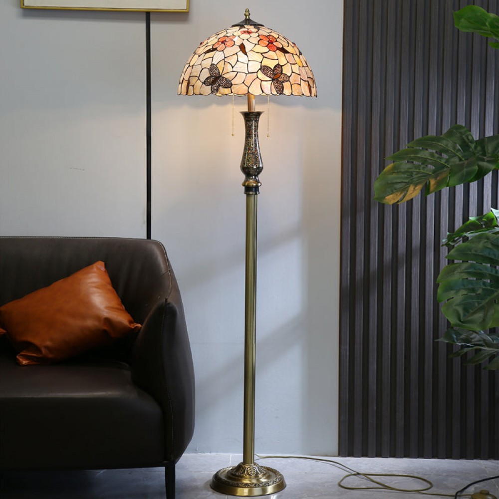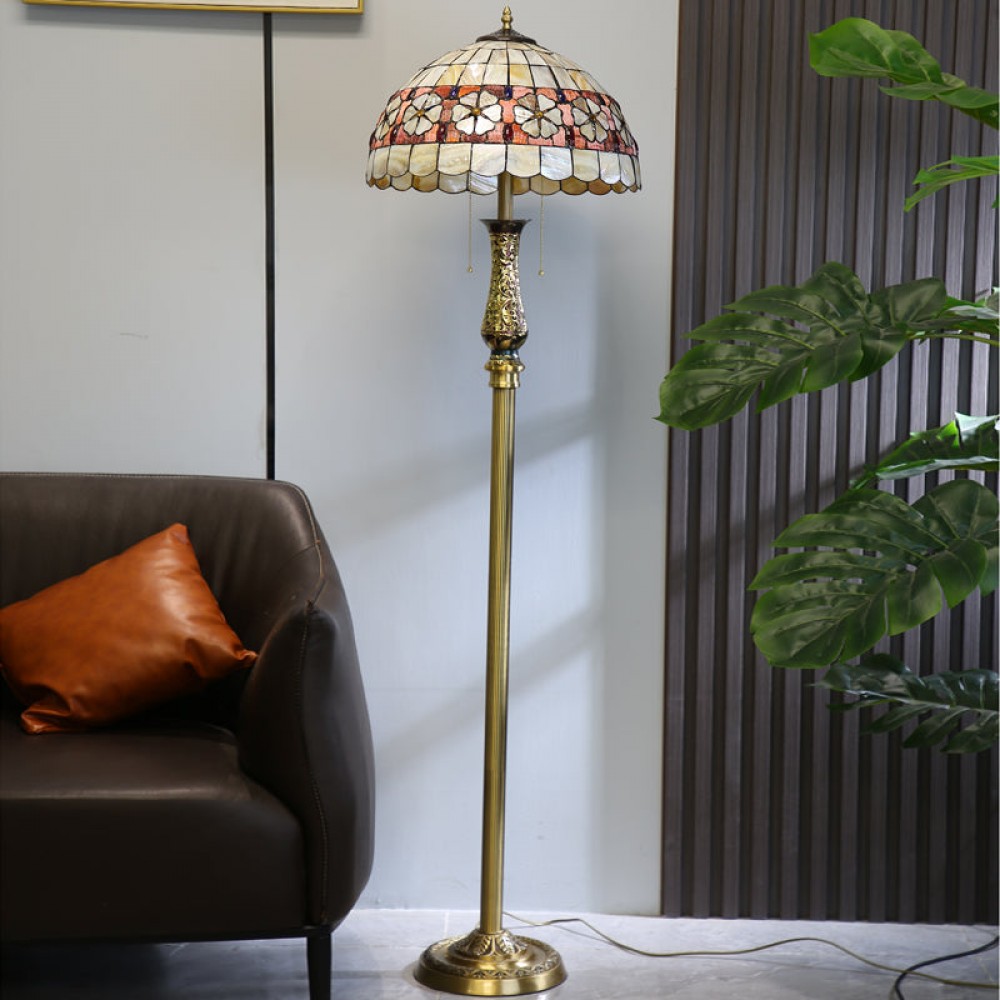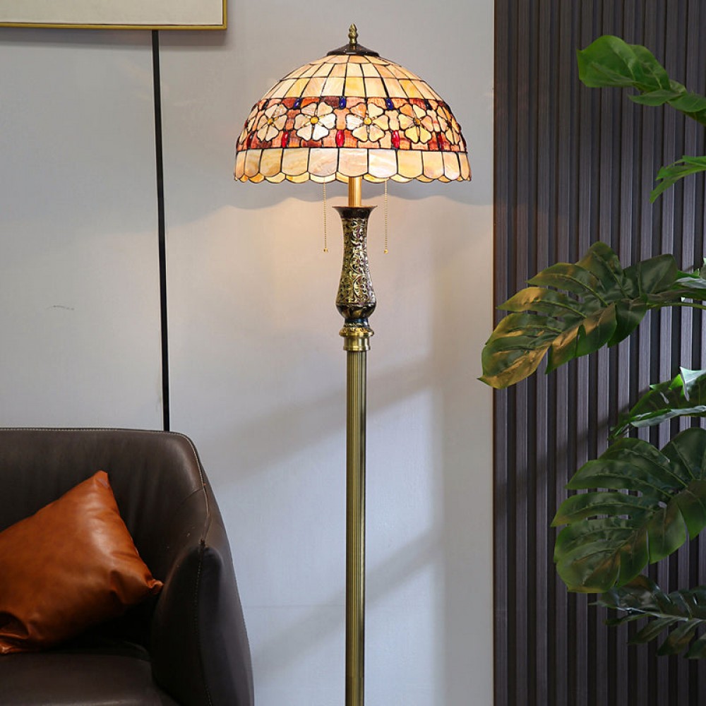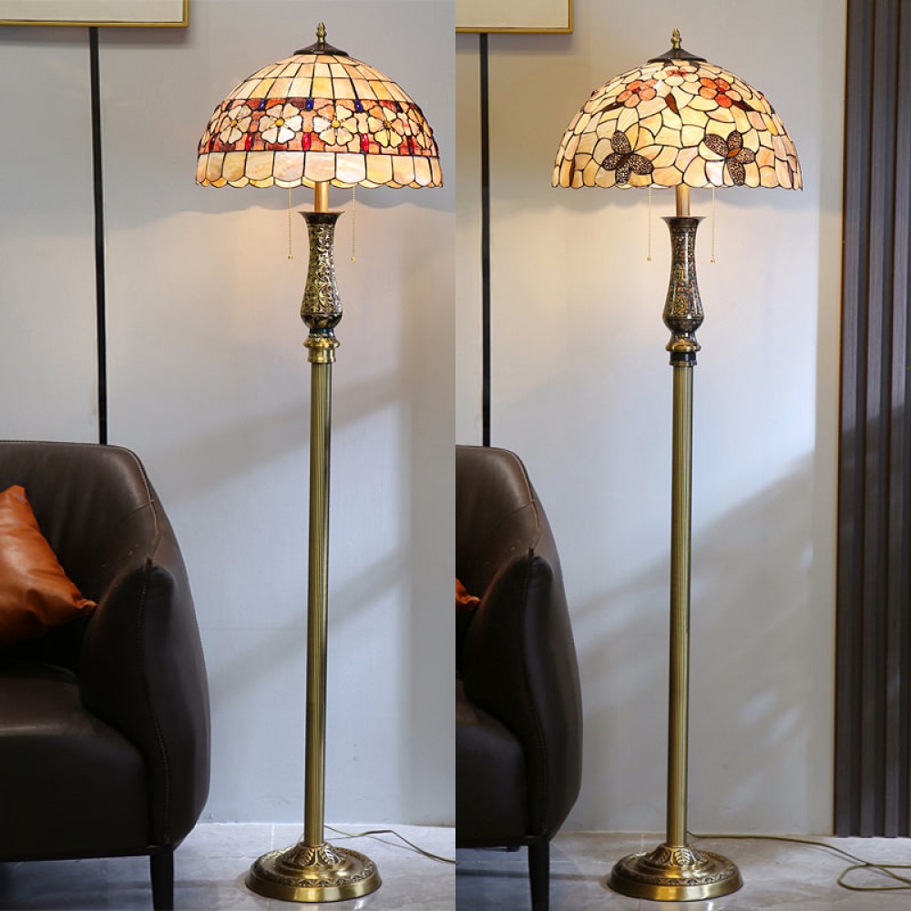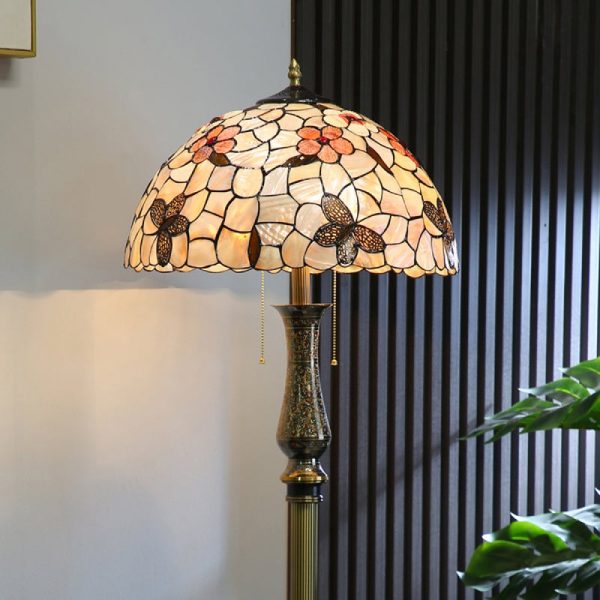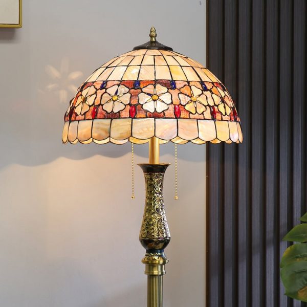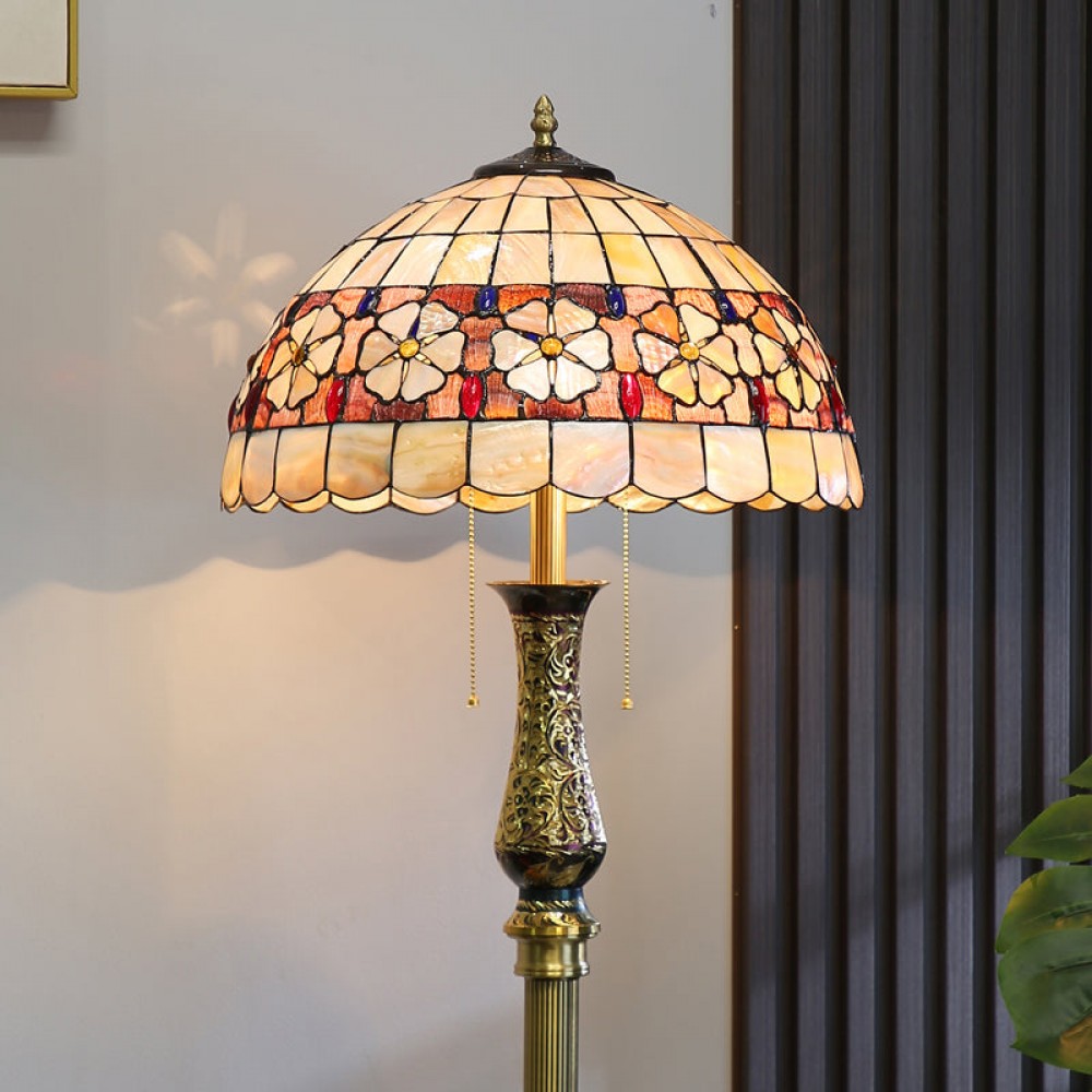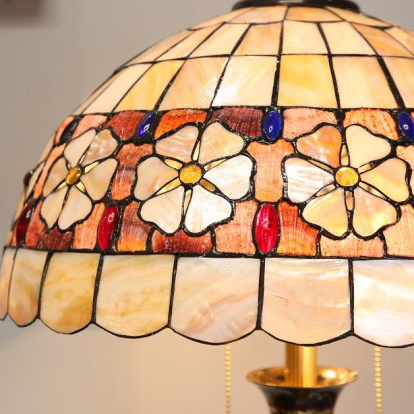 - ?This enchanting lamp is meticulously handcrafted using stained glass and cabochon accents, rendering each piece a unique masterpiece. Adorned with delightful flowers on its exquisite shell lampshade, it appears as if they are blossoming in the glow of the light.