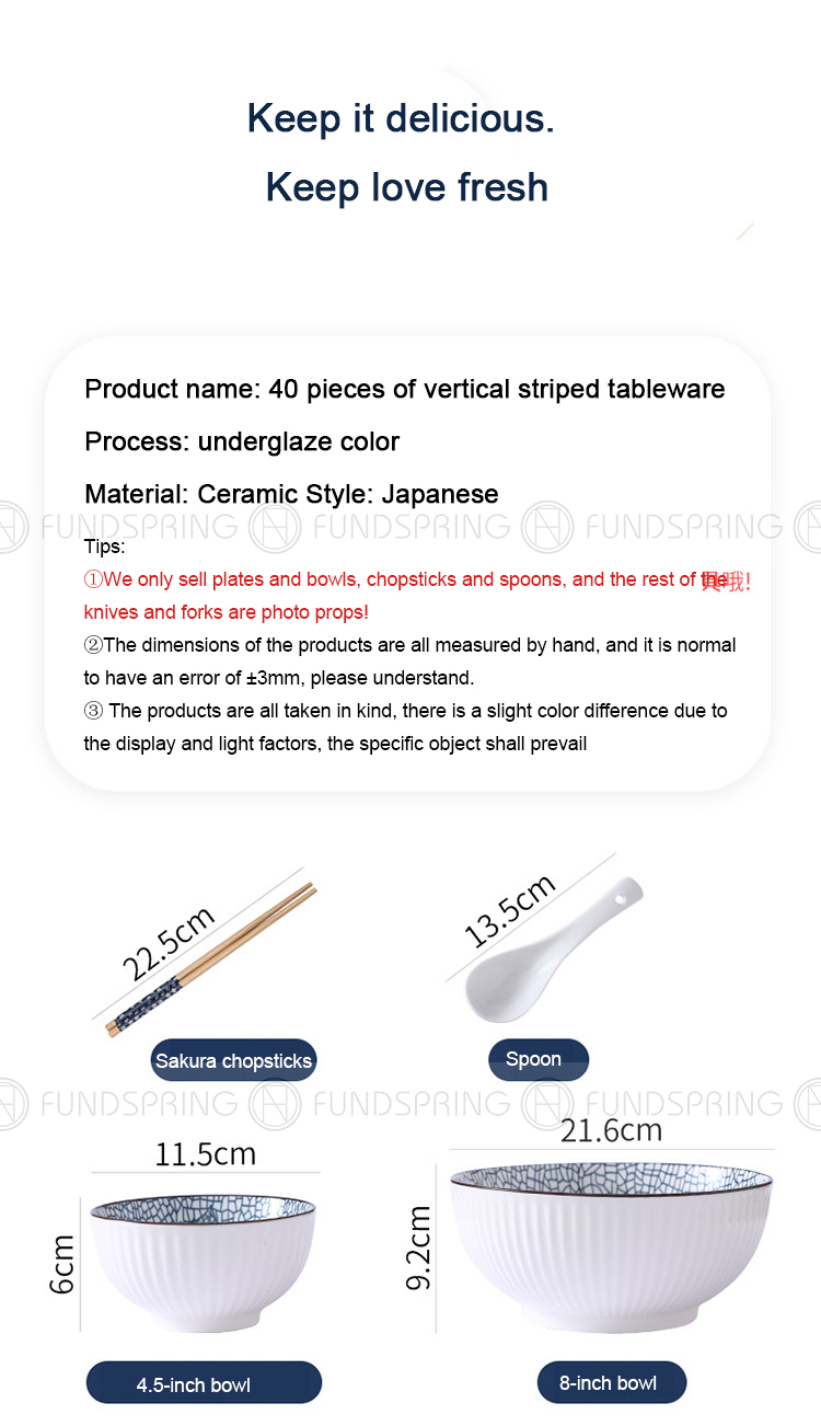 Indulge in the charm of this 40-piece ceramic dinnerware set, thoughtfully designed to elevate your dining experience. The set includes 10 4.5-inch bowls, 4 7-inch plates, 4 8-inch plates, 1 8-inch bowl, 1 oval plate, 10 small spoons, and 10 pairs of chopsticks. Crafted with precision, there are 2 series of themes, each presenting unique textures to cater to diverse tastes.