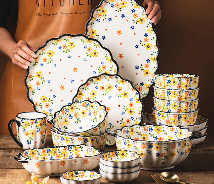 이 식기류 컬렉션 세트는 우리를 실제 자연의 즐거움으로 인도합니다. 진한 파란색 테두리로 장식된 손으로 칠한 작은 노란색 꽃과 고온에서 유약 소성, 그릇, 베이킹 세트, 머그, 접시, 충전기 및 아디쉬와 결합되어 모든 가족 구성원에게 적합하며 실내에서 실외까지 널리 사용됩니다.