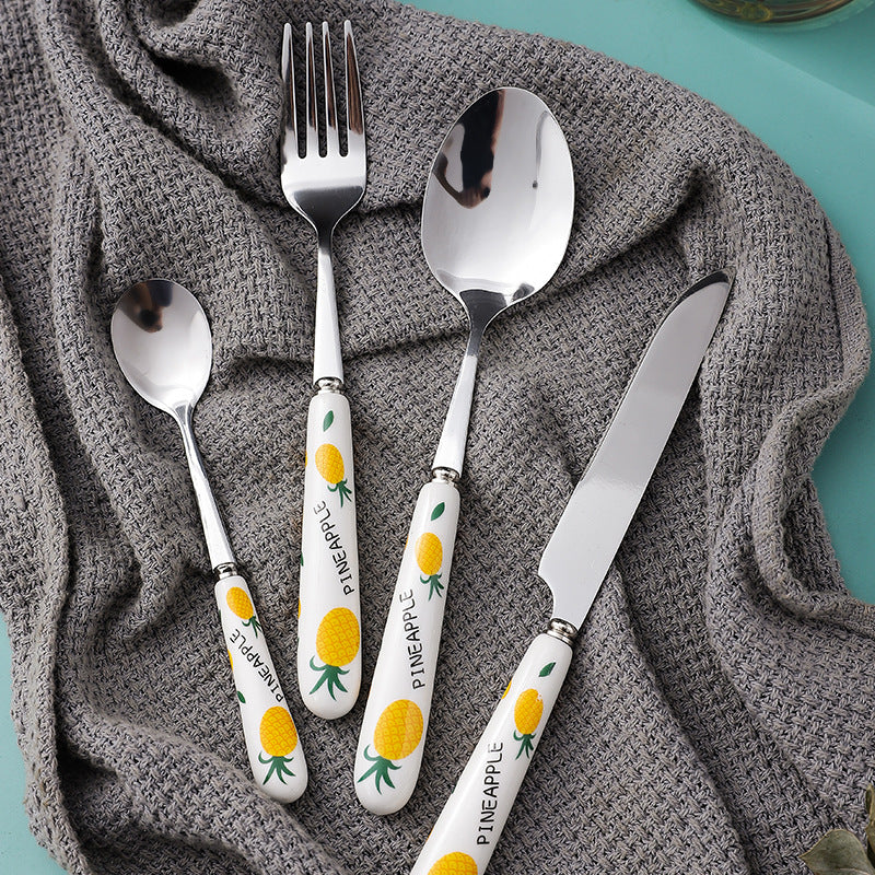 Creative  Ceramic Handle Fruit Pattern SS Fork, Knife, Spoon, Chopsticks, Steak Flatware Set