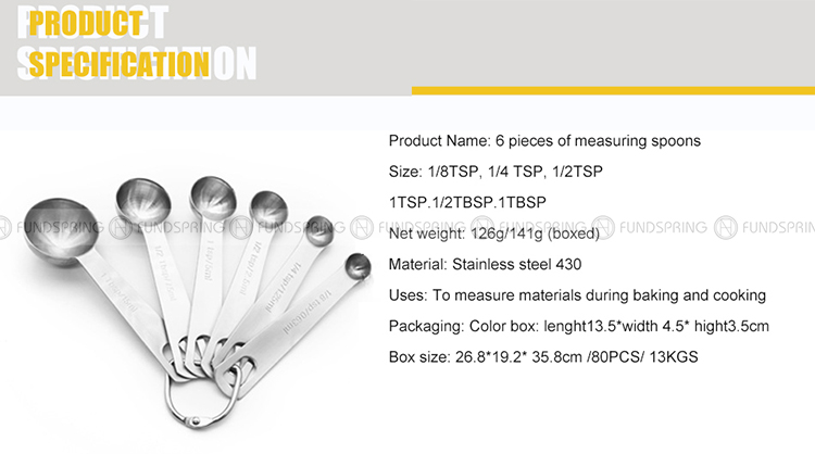 【Well-Designed Set】The tablespoon set Contains metal measuring spoons: 1/8 tsp, 1/4 tsp, 1/2 tsp, 1 tsp, 1/ 2 tbsp, 2/3 tbsp, 1 tbsp, 4 tbsp, and 1 scraper. The biggest ring allows you to nest all spoons together saving storage space, and the other two small rings help to separate some of the spoons to avoid being too heavy during cooking or baking.